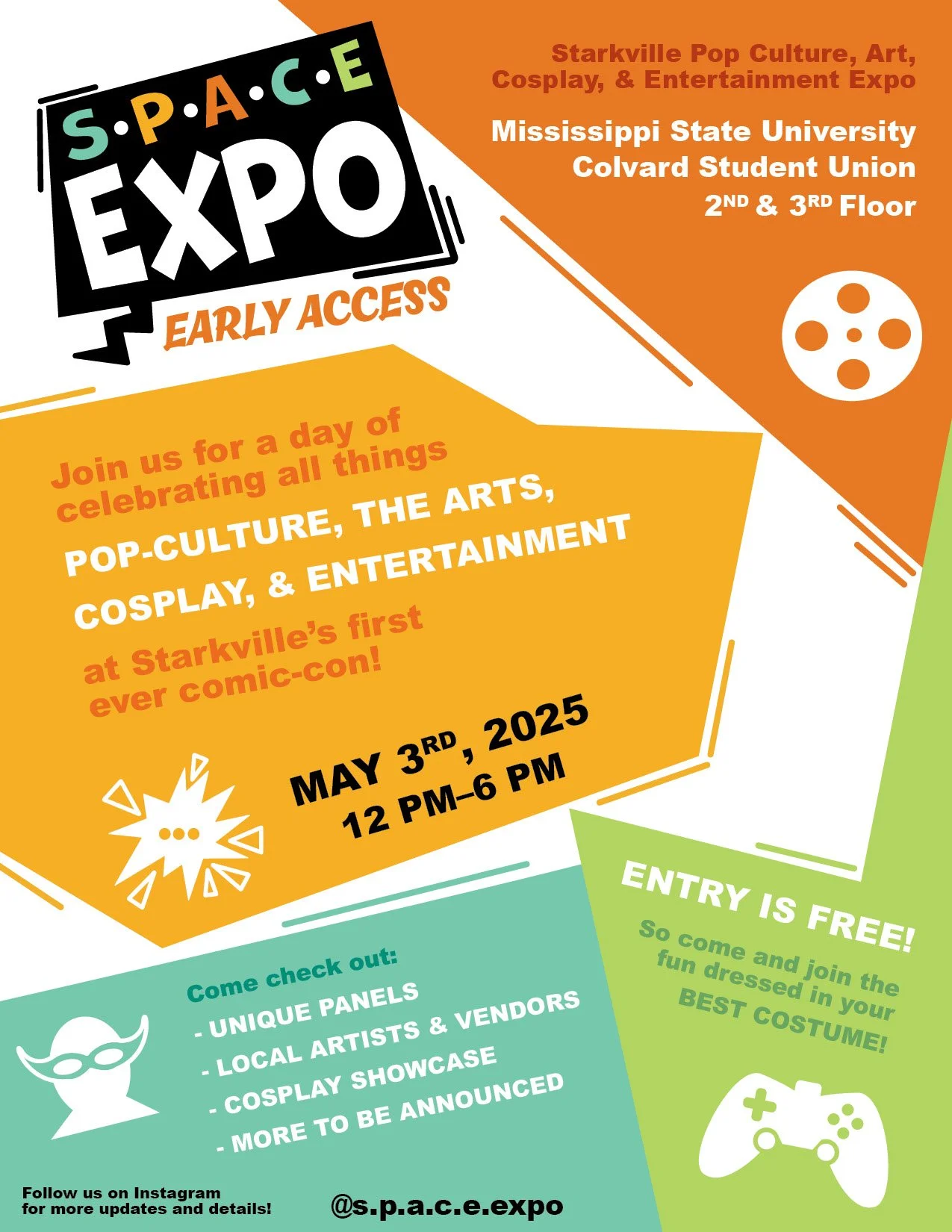 Collaborating with 5 other students, SPACE Expo: Early Access was assigned as our class’s final exam, and was Starkville’s first ever comic convention held on May 3rd, 2025. Except for the logo creation, I was to be in charge of all graphics and social media posts including guest announcments, schedules, maps, signage, etc.
